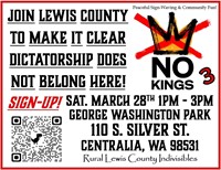 No Kings 3 - Lewis County (Rally / March) Sponsor: Rural Lewis County Indivisibles County: Lewis |